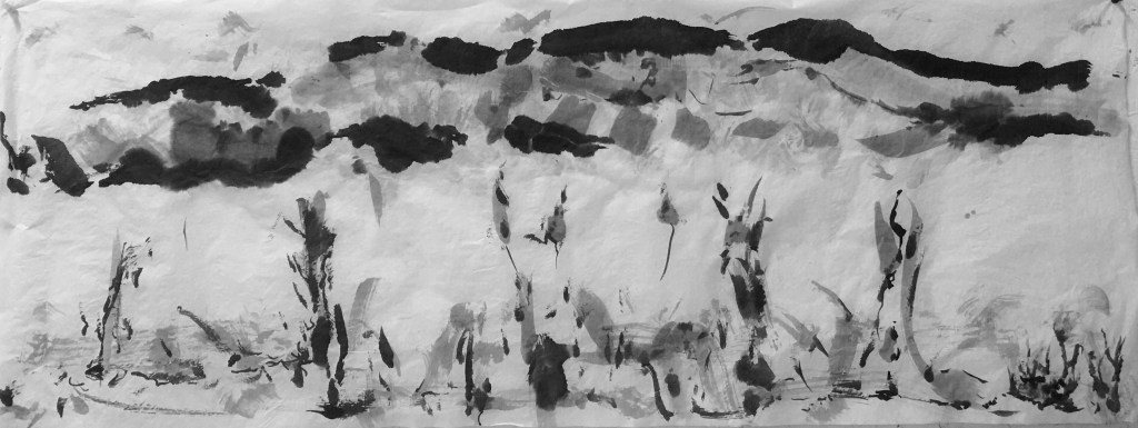 Scrolls on rice paper, small encaustic and oil paintings and prints.